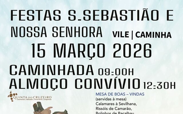Festas S. Sebastião e Nossa Senhora. Caminhada às 9h00 Almoço convivio às 12H30 na Quinta do Cruzeiro Marcações até 8 de março CONTACTOS: Ernesto Oliveira 967 095 472 Vitalina Azevedo 963 852 728