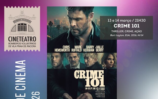 NO CINETEATRO DOS BOMBEIROS VOLUNTARIOS DE VILA PRAIA DE ANCORA DIA 13 E 14 DE MARÇO "CRIME 101" FILME DE AÇÃO M/14 DIA 27 E 28 DE MARÇO "O PODER DA MUDANÇA" DRAMA M/12 RESERVA BILHETES: 913928313
