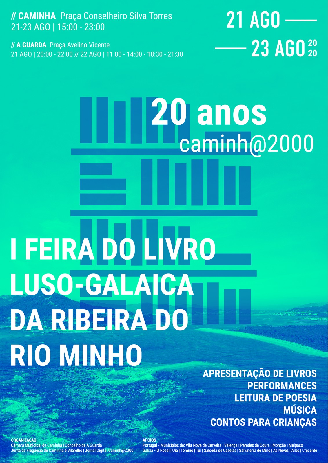 A I FEIRA DO LIVRO LUSO-GALAICA DA RIBEIRA DO RIO MINHO, integrada nas comemorações do 20º aniversário do Jornal Digital Caminh@2000, decorrerá em Caminha e A Guarda, entre os dias 21 e 23 de agosto, organizada pelos municípios de Caminha e a A Guarda, Junta de Freguesia de Caminha e Vilarelho e Jornal Digital Caminh@2000.