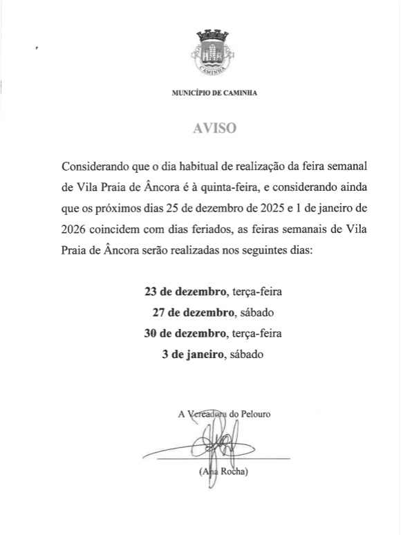 Alteração da Feira Semanal de Vila Praia de Âncora