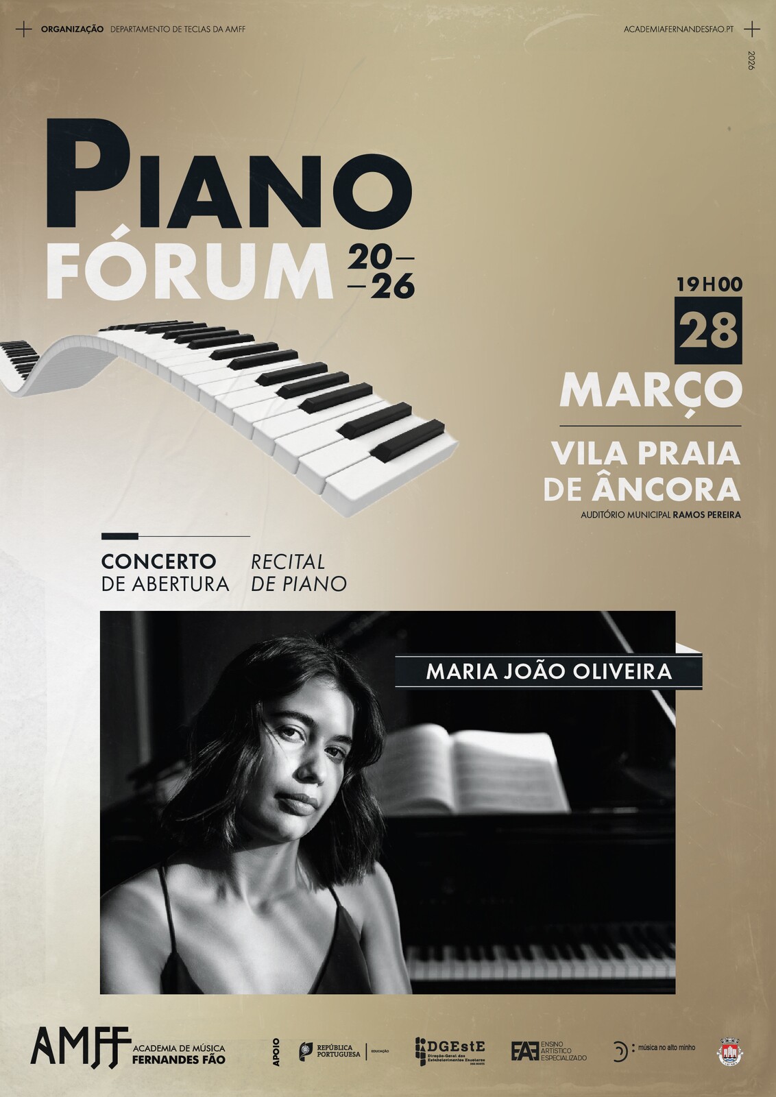 O Concerto de Abertura com a Pianista Maria João Oliveira, terá lugar dia 28 de março, pelas 19H00.