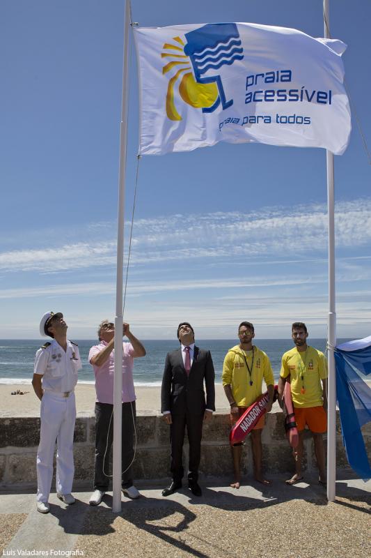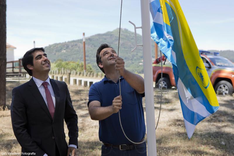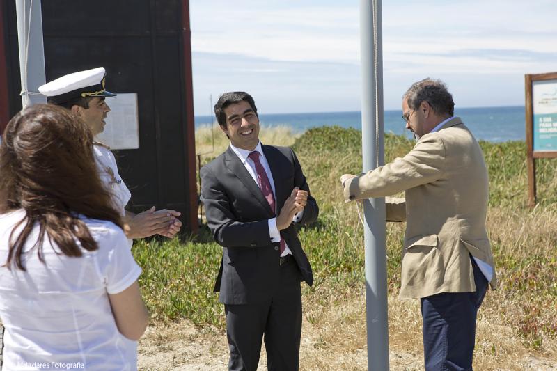 \r\nAntes do hastear da bandeira houve oportunidade para visitar as obras na Duna dos Caldeirões. Recorde-se que a empreitada "Reforço e Proteção dos Sistemas Dunares e Renaturalização de áreas naturais degradadas - 2ª Fase" está orçada em 402.848 € e contempla medidas corretivas de erosão superficial e ações de reordenamento de áreas construídas em zonas de risco e consequente reposição das condições de ambiente natural, nomeadamente a consolidação e fixação de margens do rio Âncora, com recurso a técnicas de bioengenharia; a construção de um esporão deflector na margem esquerda do rio Âncora, em enrocamento e estacas com vegetação plantada; a reabertura do leito secundário do Rio Âncora; a movimentação de areias na praia para reforço do cordão dunar; e a colocação de uma cortina de paliçadas na área do anterior rompimento da Duna, por forma a favorecer a retenção de areias nessa zona.