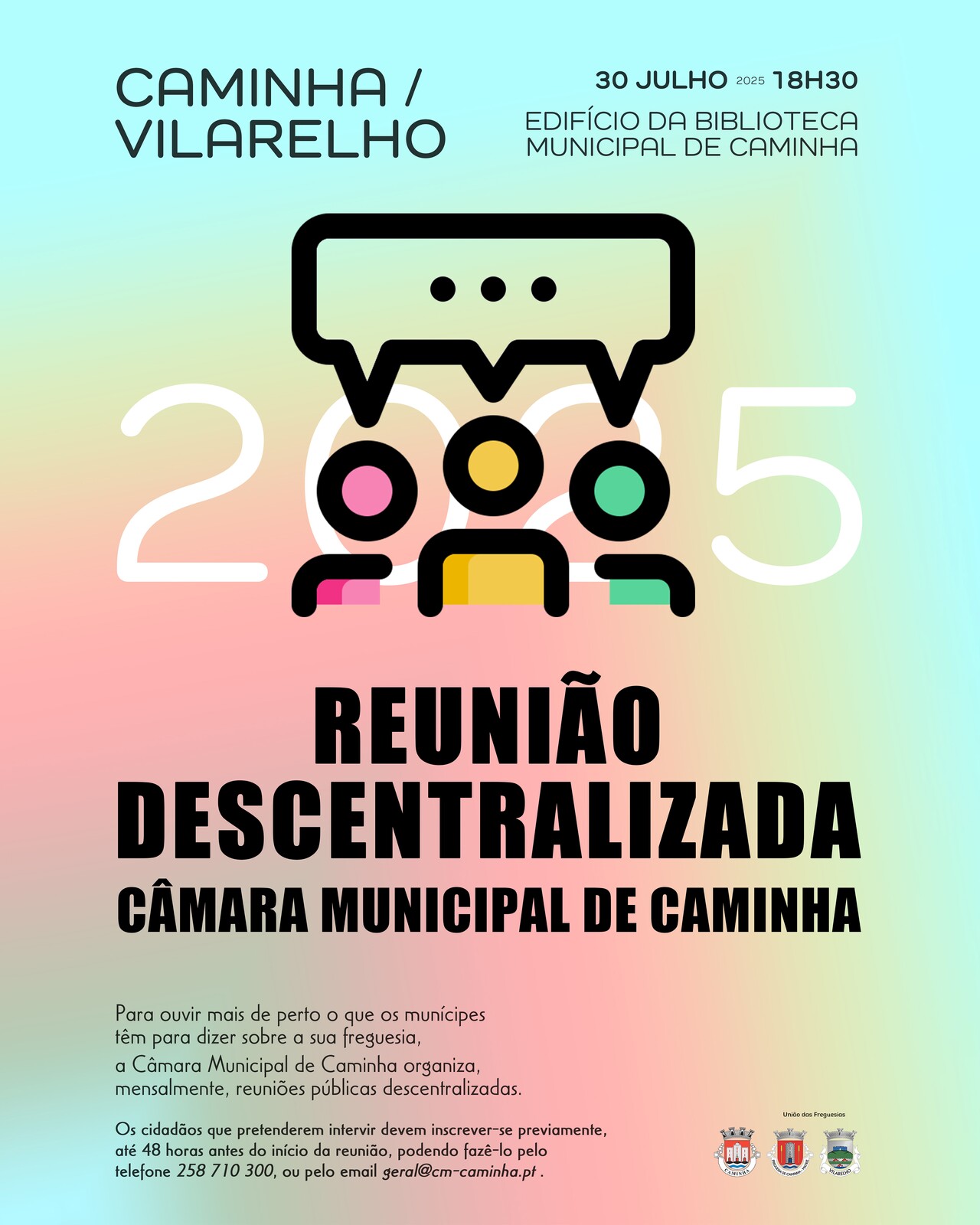 A próxima reunião descentralizada da Câmara Municipal de Caminha vai ter lugar na União de Freguesias de Caminha e Vilarelho, no dia 30 do corrente mês, pelas 18h30. Mensalmente, o Executivo Caminhense dirige-se a cada uma das freguesias do concelho para ouvir o que os fregueses têm a dizer sobre a sua freguesia. Este mês, o Executivo camarário vai até Caminha para um encontro com os munícipes, que terá lugar no edifício da Biblioteca Municipal de Caminha.