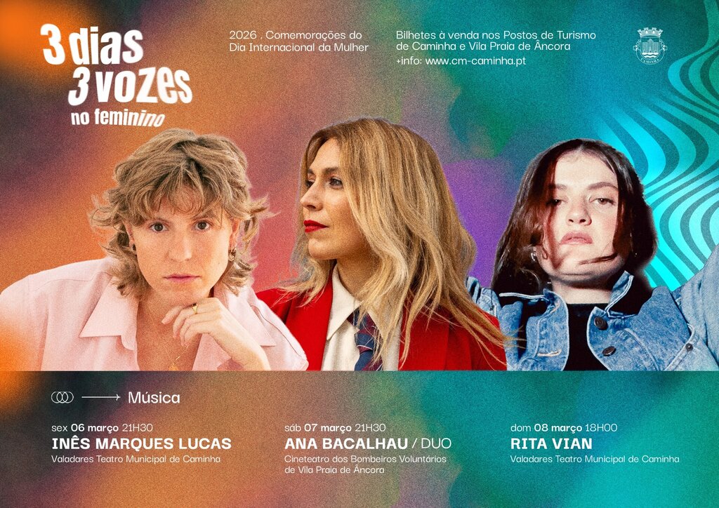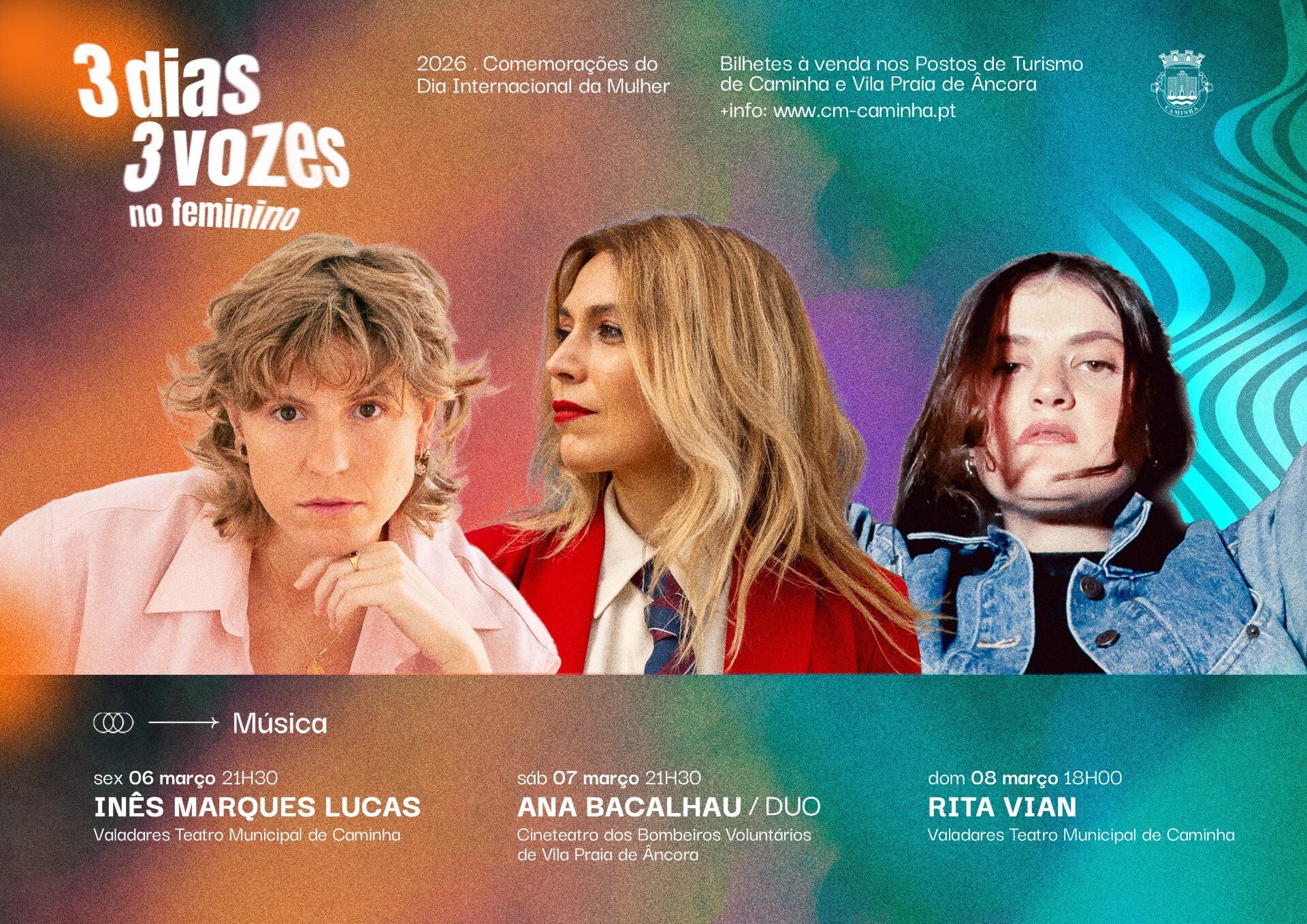 A Câmara Municipal de Caminha vai comemorar o Dia Internacional da Mulher com a iniciativa “3 dias, 3 vozes no feminino”, com as atuações de Inês Marques Lucas, Ana Bacalhau/duo e Rita Vian em Caminha e Vila Praia de Âncora, nos dias 6, 7 e 8 de março.