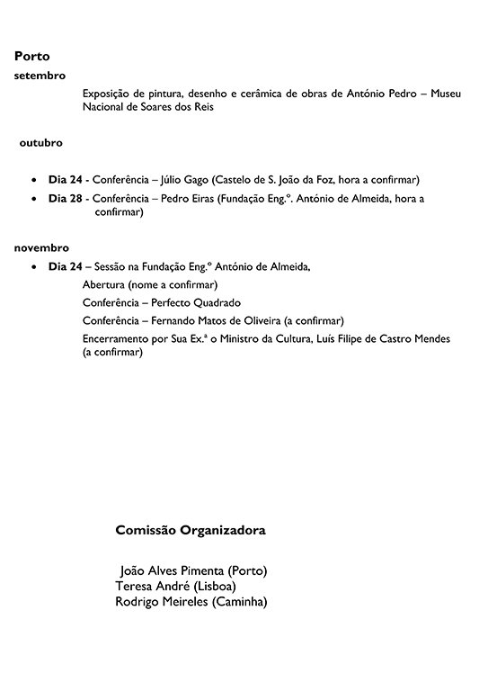 \r\n2- É intenção da Comissão Organizadora da homenagem recordar não só a figura imponente, em todos os aspetos, de António Pedro, mas sobretudo reviver a sua obra e a sua incansável ação, em prol da modernidade;