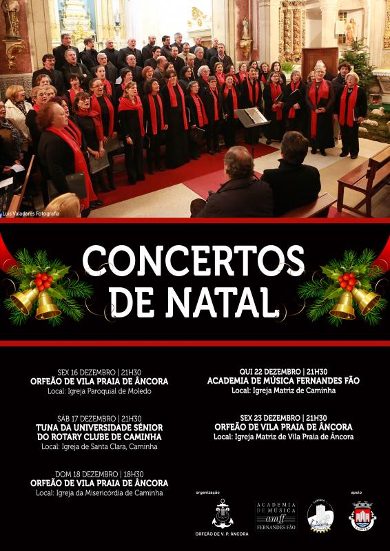 Os Concertos de Natal vão aquecer os fins de tarde e as noites frias dos próximos dias. Os concertos de Natal no concelho de Caminha arrancam sexta-feira, dia 16 de dezembro, na Igreja Paroquial de Moledo, com a atuação do Orfeão de Vila Praia de Âncora. Os concertos de Natal fazem parte da programação de Natal que está a decorrer no concelho e que até ao início de 2017 são 40 dias, 40 atividades e 16 instituições envolvidas.