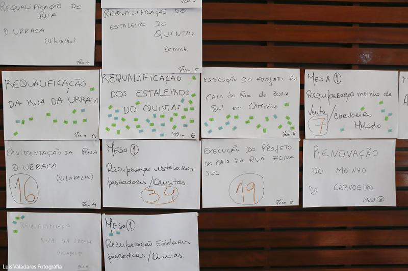 \r\nOs seus proponentes fizeram depois a apresentação e defesa das suas ideias, abrindo-se a seguir o período de votação, com o seguinte resultado: Requalificação dos Estaleiros do Quintas (34 votos); Execução do arranjo do Cais da Rua, Sul de Caminha (19); Requalificação da Rua D. Urraca em Vilarelho (16); Recuperação do moinho de Vento/Carvoeiro em Moledo (7); Pavimentação do Estradão do Montanhão entre Cristelo e Vilarelho (7); Retirar águas bravas da Travessa de Santana em Moledo (1) e Arranjo do paredão /sul em Moledo (0).