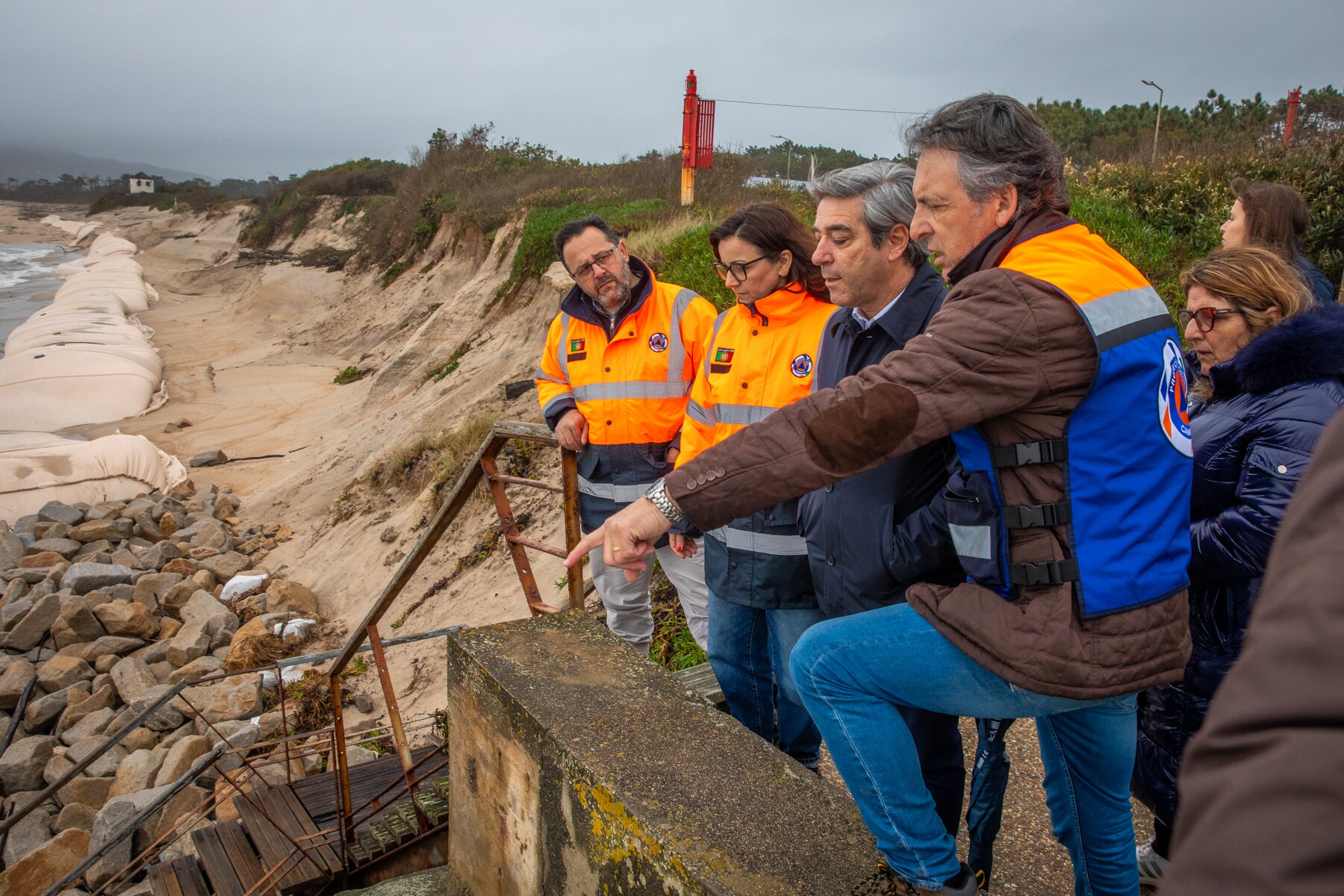 A comitiva iniciou o percurso na praia de Moledo, onde foi possível verificar no terreno o estado atual do areal e a intervenção de caráter urgente realizada na zona norte do paredão, fundamental para a proteção costeira e para a segurança de pessoas e bens.