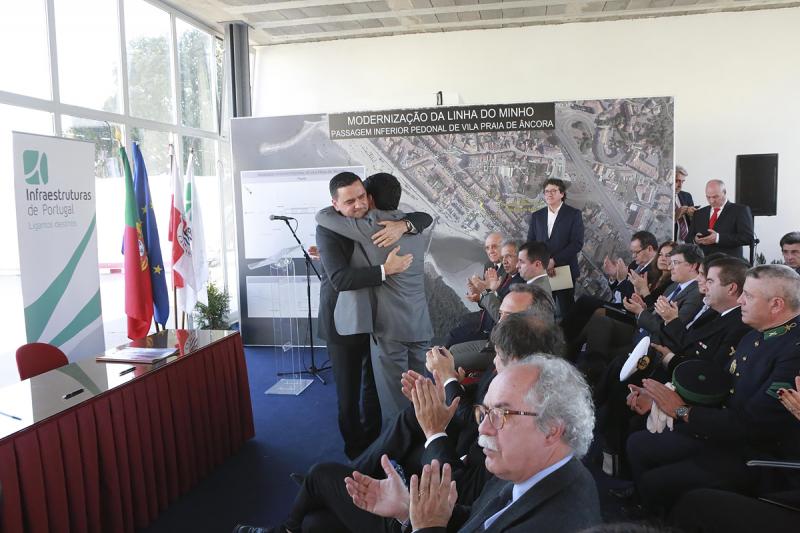 O lançamento do concurso que compreende a construção de uma Passagem Inferior Pedonal na Linha do Minho, na zona da Travessa do Teatro, em Vila Praia de Âncora foi realizado hoje, dia em que a Câmara Municipal e a IP assinaram também o respetivo protocolo. A obra vai custar cerca de meio milhão de euros e culmina um longo processo de negociação iniciado por este Executivo, que assim responde, da melhor forma, aos anseios e à luta da população da Vila. Como referiu Miguel Alves, "hoje é um dia bom para Vila Praia de Âncora". A cerimónia decorreu num espaço municipal junto à Linha do Minho, precisamente no local onde a passagem vai nascer, na presença do ministro do Planeamento e das Infraestruturas, Pedro Marques, e dos secretários de Estado das Infraestruturas e do Desenvolvimento e Coesão, respetivamente, Guilherme Oliveira Martins e Nélson de Souza.