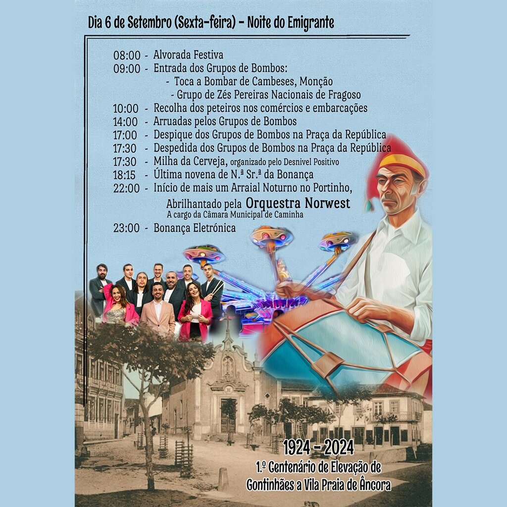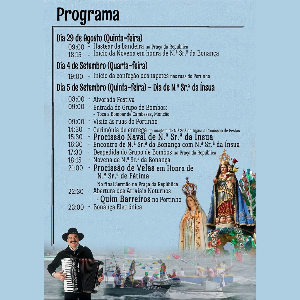 O programa é vasto, mas o realce, logo no dia 5 de setembro, vai para a tradicional Procissão Naval de Nossa Senhora da Ínsua. Para a noite está agendado um concerto com Quim Barreiros.