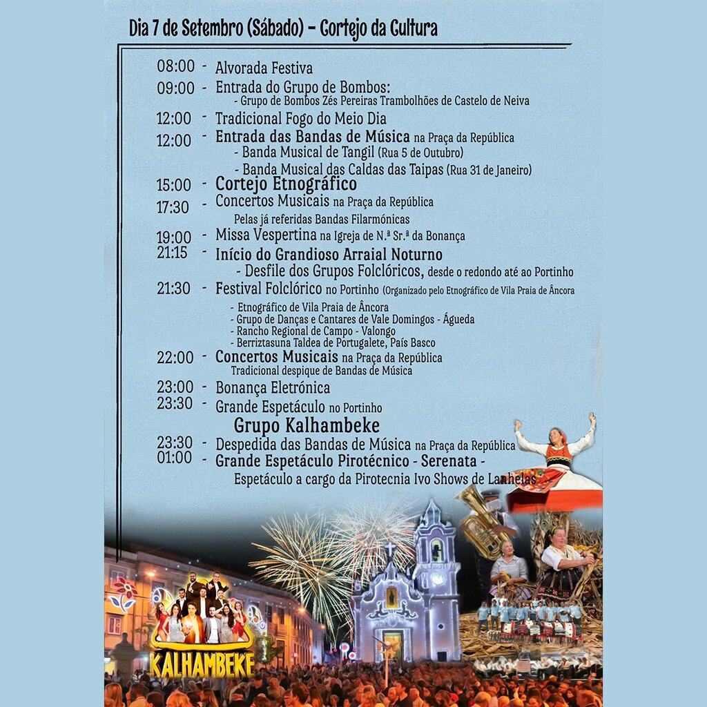 Dia 7 de setembro, sábado, o Cortejo Etnográfico é o momento mais aguardado. Terá ainda lugar um Festival Folclórico e, pelas 23h30, o palco é do grupo Kalhambeke. O programa termina com um espetáculo de fogo de artifício.