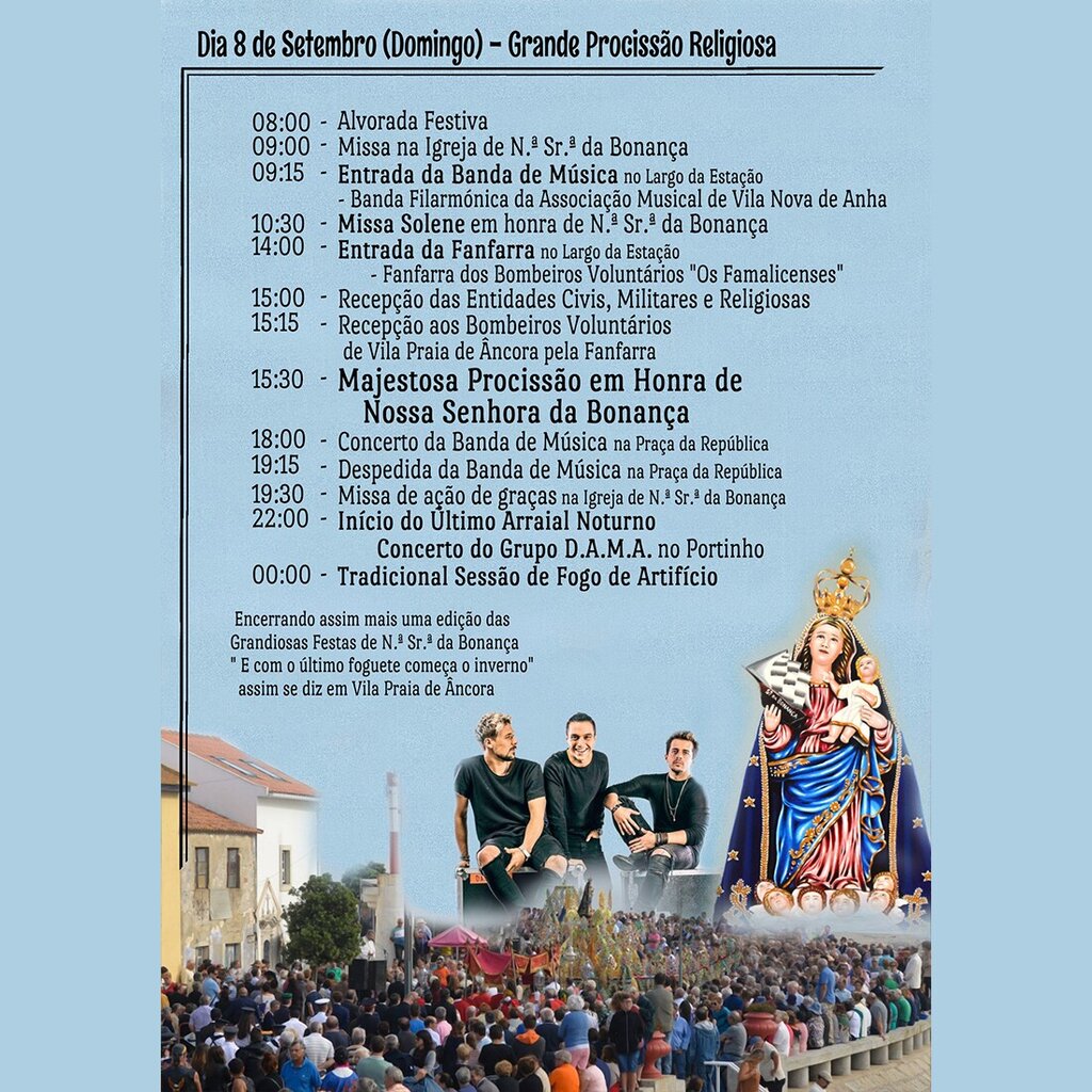 Domingo, último dia das Festas, vai realizar-se a Majestosa Procissão em Honra de Nossa Senhora da Bonança. À noite atuam os DAMA. Uma sessão de fogo de artifício encerrar as Festas.