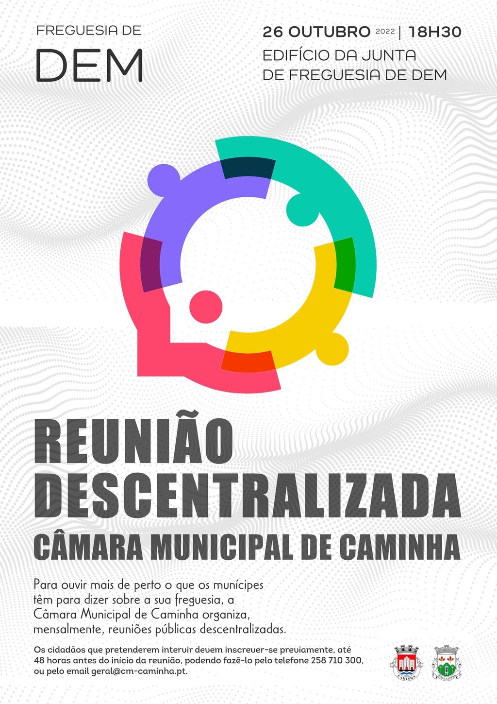 A próxima reunião pública descentralizada vai acontecer na próxima semana, no dia 26 de outubro, no edifício da Junta de Freguesia de Dem. As inscrições já estão a decorrer, podendo ser feitas na Junta de Freguesia local, na Câmara Municipal, ou através de telefone (258710300), ou por email: geral@cm-caminha.pt