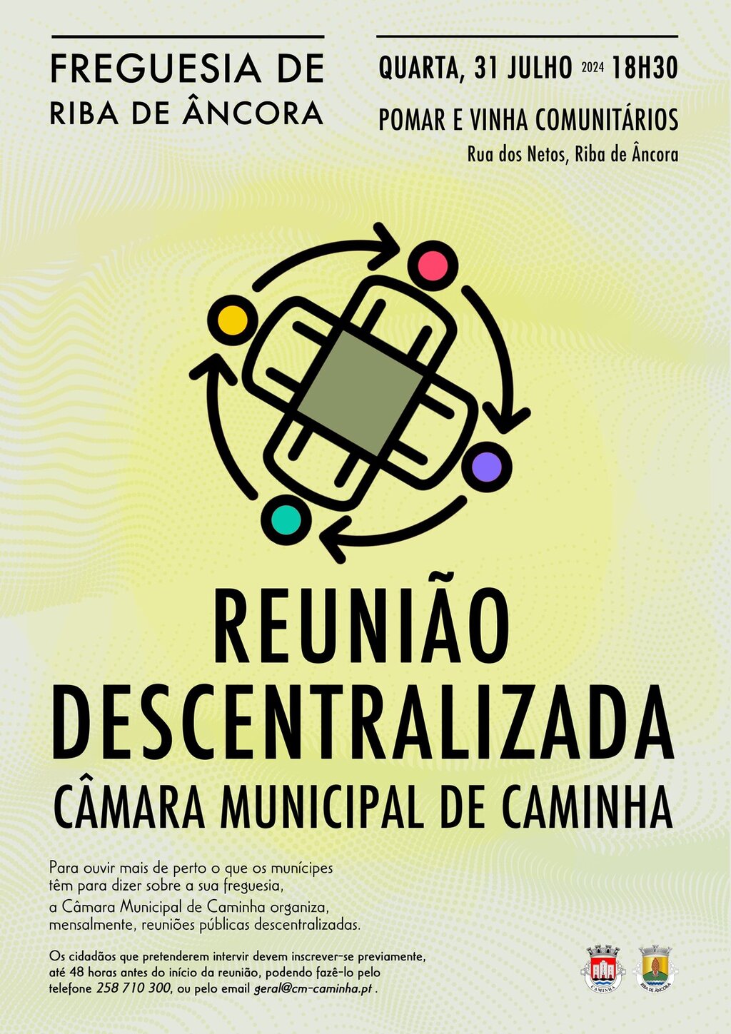 Mensalmente, o executivo Caminhense dirige-se a cada uma das freguesias do concelho para ouvir o que os fregueses têm a dizer sobre a sua freguesia. Este mês, o executivo camarário vai até Riba de Âncora. A reunião vai decorrer no dia 31 de julho, pelas 18H30, no Pomar e Vinha Comunitários. Os cidadãos interessados em participar, podem fazer a respetiva inscrição através do telefone 258 710300, ou por email: geral@cm-caminha.pt até 48 horas antes da data reunião.
