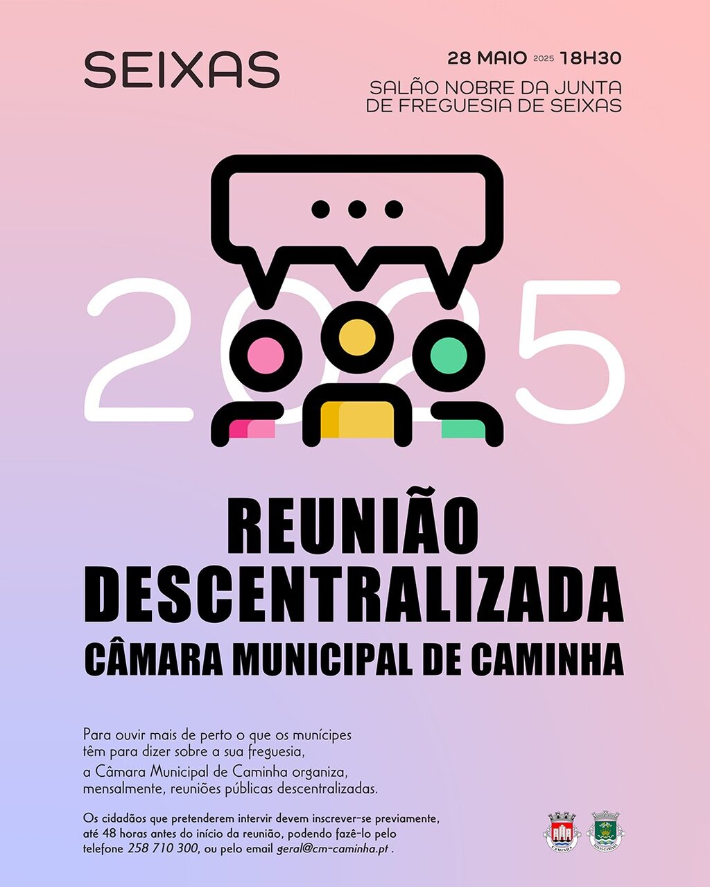 Os cidadãos interessados em participar, podem fazer a respetiva inscrição através do telefone 258 710300, ou por email: geral@cm-caminha.pt até 48 horas antes da data reunião.