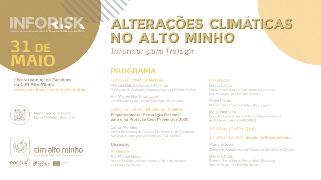 A CIM Alto Minho encontra-se a implementar, ao abrigo da operação "INFO-RISK: Informar sobre os riscos associados às alterações climáticas no Alto Minho", um seminário que visa enquadrar, no tempo e no espaço, o fenómeno das alterações climáticas, informando sobre os riscos potenciados pelo mesmo no contexto territorial do Alto Minho. Por forma a tornar a troca de ideias tão profícua e participativa quanto possível, será promovida uma conversa em formato oficina de trabalho, com possibilidade de visualização à posteriori através das redes sociais, com o propósito de sensibilizar, informar e mobilizar os participantes para a ação climática.