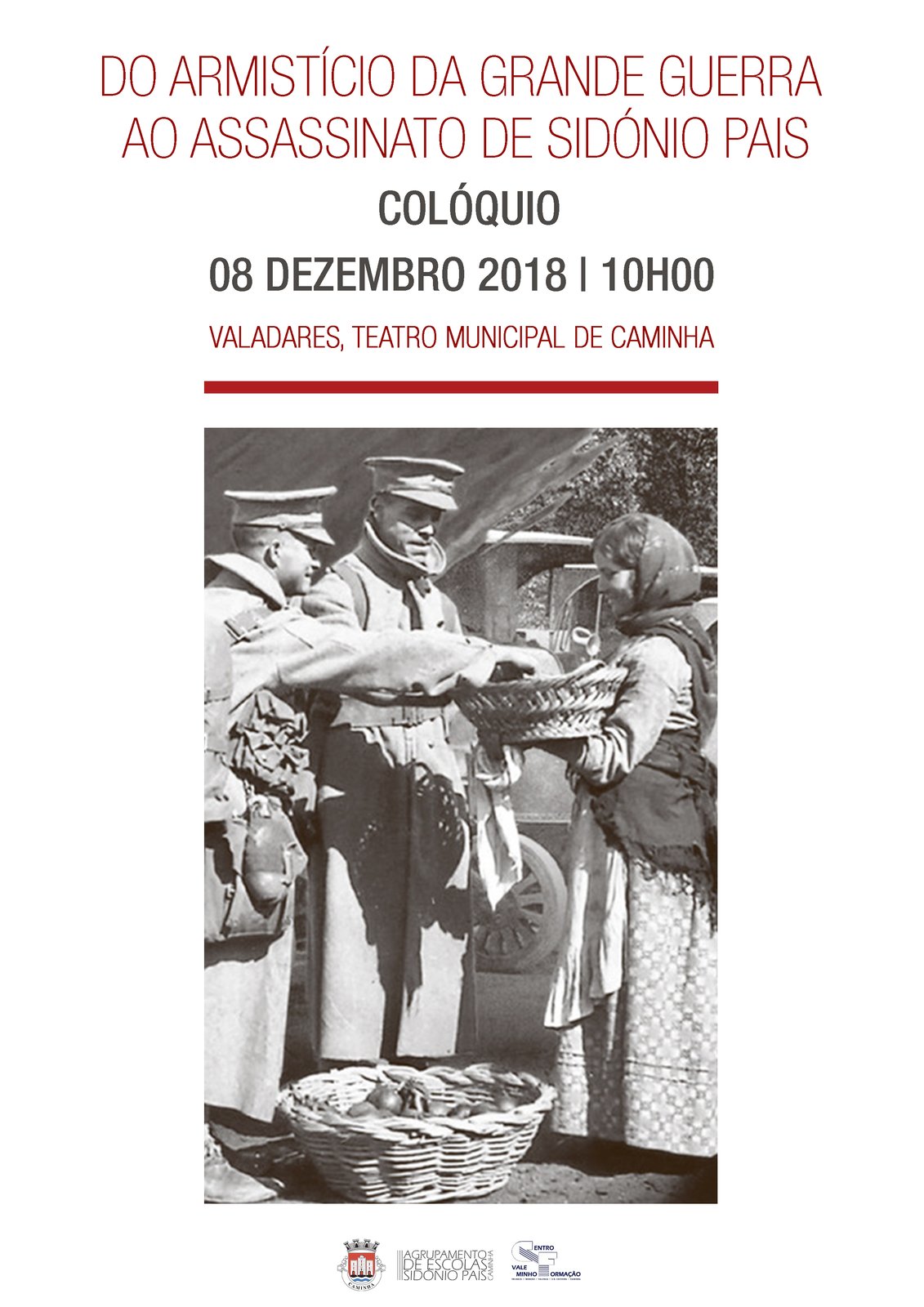 A Câmara Municipal de Caminha e o Agrupamento de Escolas Sidónio Pais vão promover o colóquio “Do Armistício da Grande Guerra ao Assassinato de Sidónio Pais”, com a participação de José Santos, Paulo Torres Bento, Armando Malheiro e Fernando Rosas. O evento decorre no próximo sábado, dia 8 de dezembro, pelas 10H00, no Valadares, Teatro Municipal de Caminha. Este colóquio encerra as comemorações “Do Armistício da Grande Guerra ao Assassinato de Sidónio Pais”.