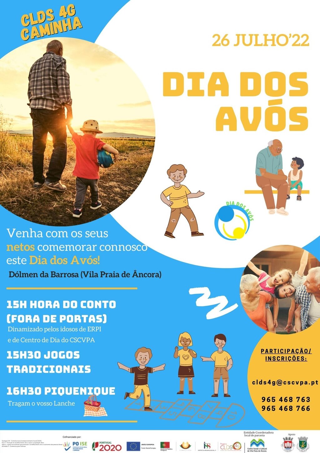 No próximo dia 26 de julho, no Dólmen da Barrosa, em Vila Praia de Âncora, vamos comemorar o Dia dos Avós. O Centro Social e Cultural de Vila Praia de Âncora, com o apoio da Câmara Municipal de Caminha e a Junta de Freguesia de Vila Praia de Âncora, apresenta uma tarde recheada de animação e convívio para os Avós & Netos do concelho.