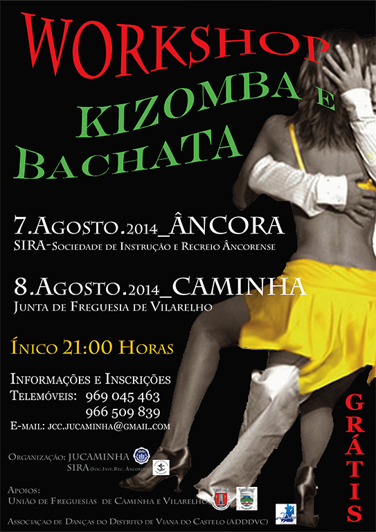 A SIRA e o JUCAMINHA estão a organizar um workshop gratuito de danças "kizomba e bachata", que terá lugar em Âncora, na sede da Sociedade de Instrução e Recreio Âncorense (SIRA), no próximo dia 7 de agosto, às 21h00, e em Caminha, no salão da Junta de Freguesia de Vilarelho, no dia 8 de agosto, também pelas 21h00.