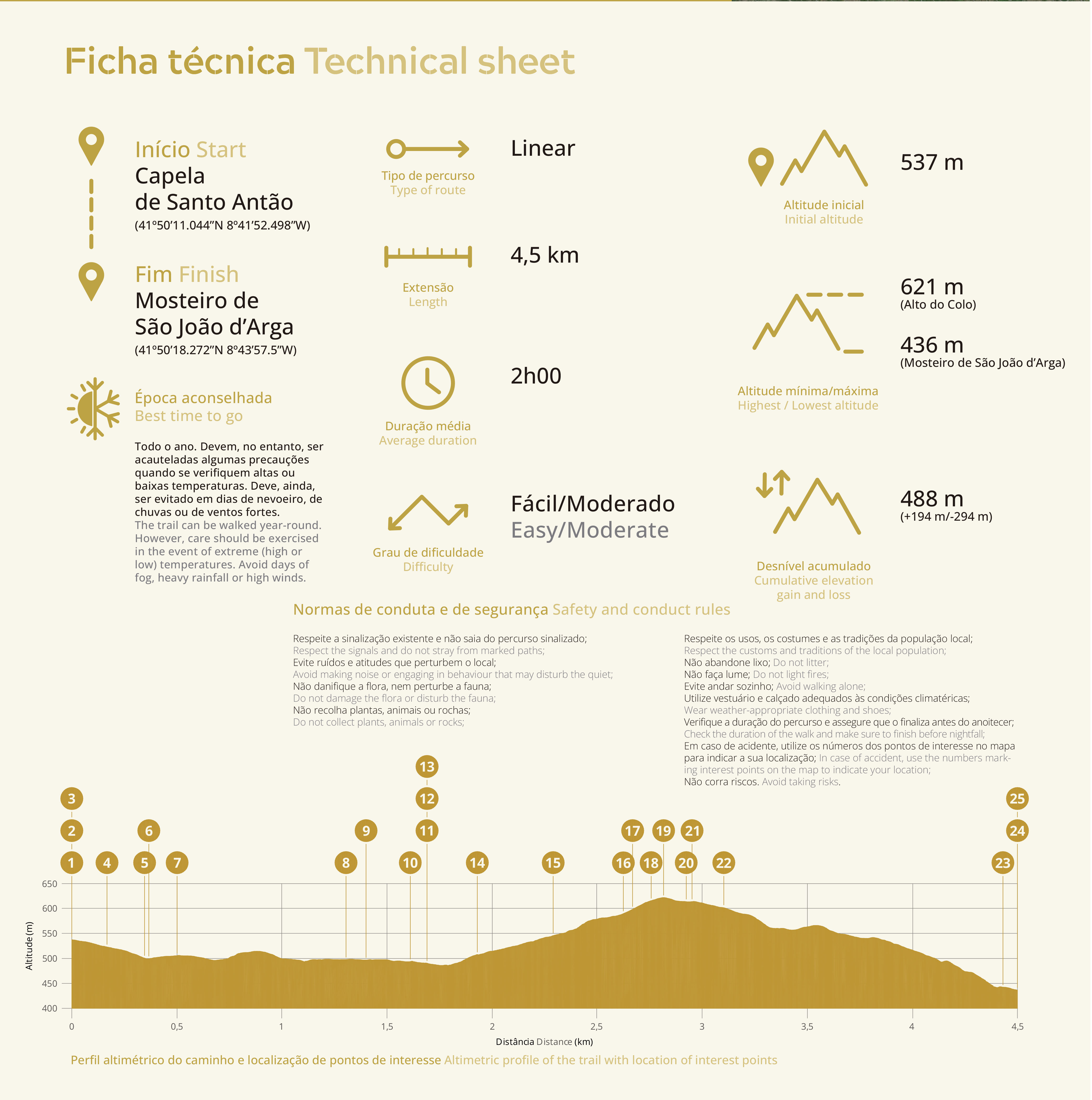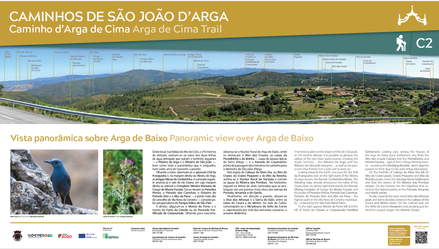 Após o Centro de Interpretação da Serra d’Arga (CISA), o caminho segue pelo antigo Caminho do Potão, ao encontro do ponto mais alto do percurso, situado numa cumeada do Alto do Colo. Ao longo da subida, são muitos os pontos que convidam a parar e a admirar os picos distantes do Parque Nacional da Peneda-Gerês, o Cabeço do Meio Dia, os casarios das Argas de Cima, de Baixo e de São João e a foz do Minho, guardada pelo icónico Monte de Santa Tecla.