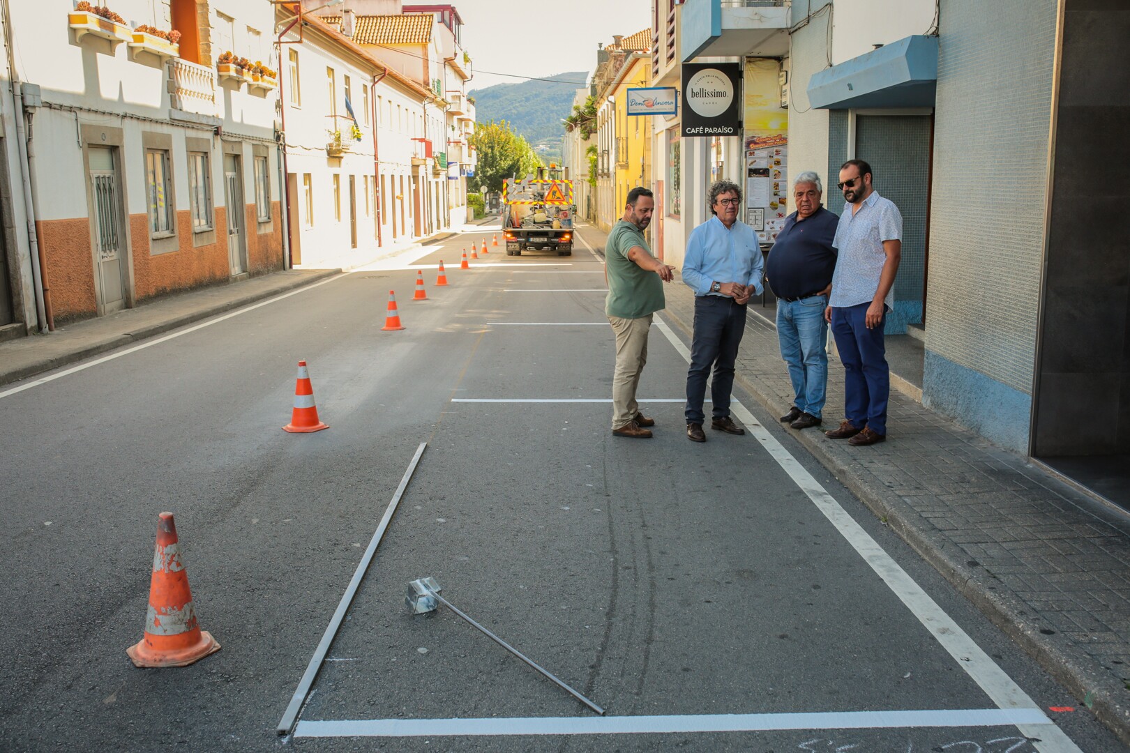Os trabalhos correspondem à colocação de sinalética vertical e pinturas no pavimento, passando pela fresagem das marcas rodoviárias existentes e pintura de novas linhas e marcação de lugares de estacionamento e execução de passadeiras para peões.