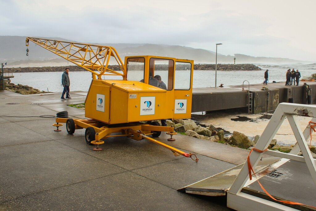 Grua móvel instalada no Portinho de Vila Praia de Âncora para garantir segurança aos pescadores